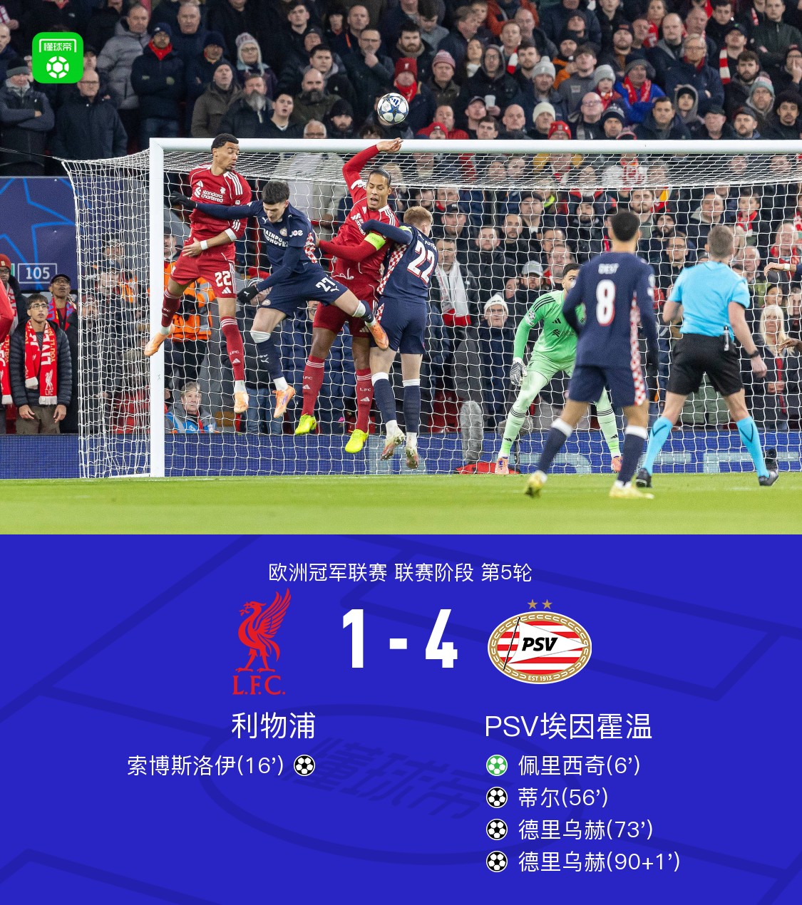 最终,利物浦主场1-4惨败埃因霍温,遭遇各项赛事三连败