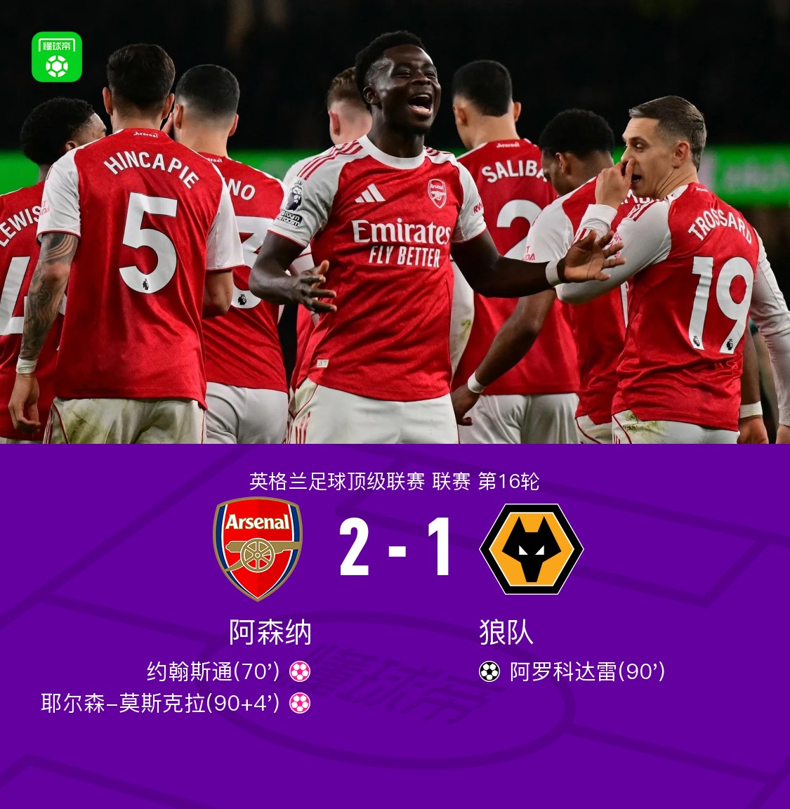 全场比赛结束,阿森纳2-1战胜狼队,送给对手十连败